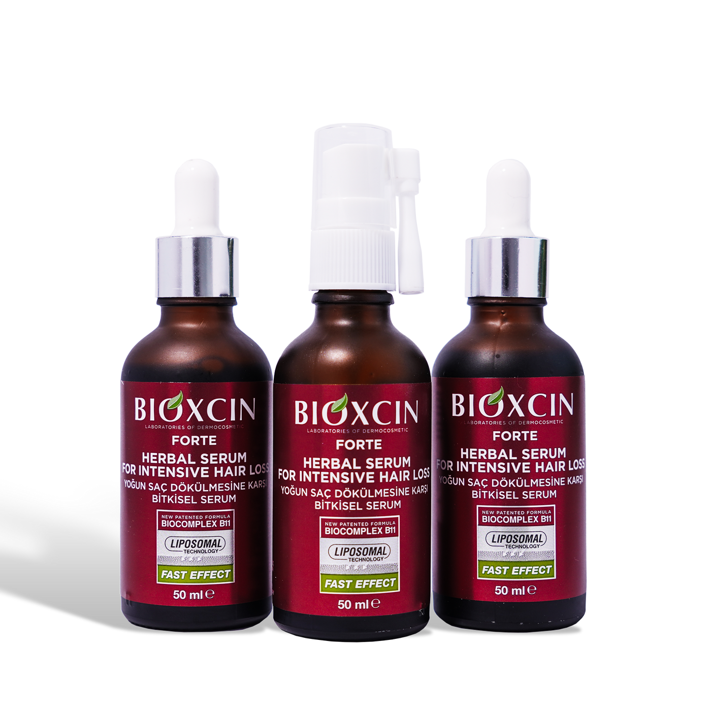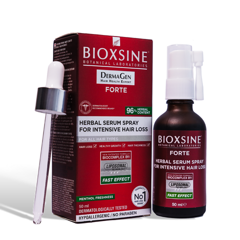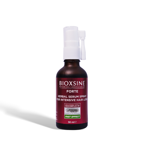 Bioxcin Forte Herbal Serum Spray is a hair growth serum that utilizes the BioComplex B11 formula, combining specially selected phyto-extracts to help reduce hair loss and promote thicker, stronger hair. It is designed to improve hair resilience, volume, and shine.