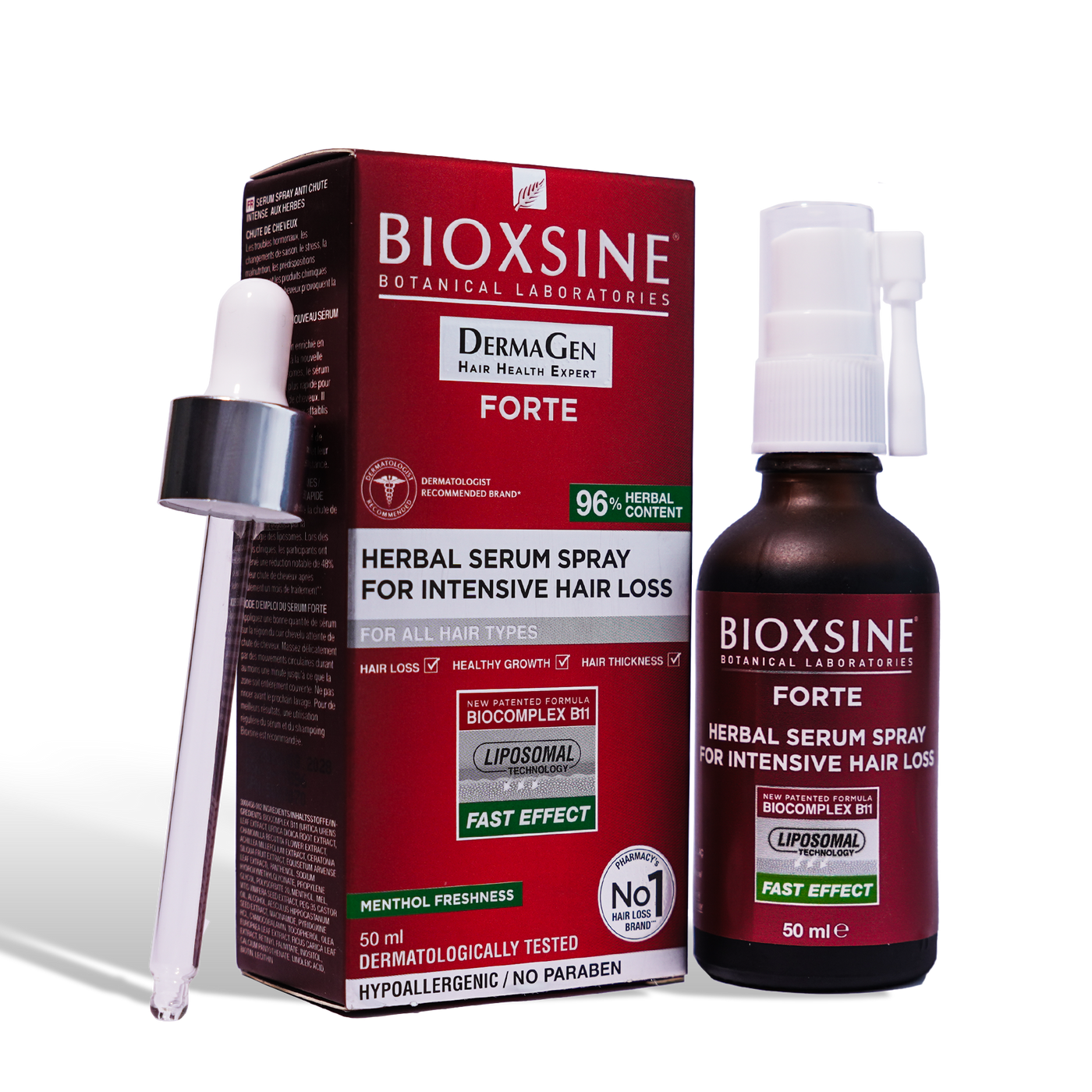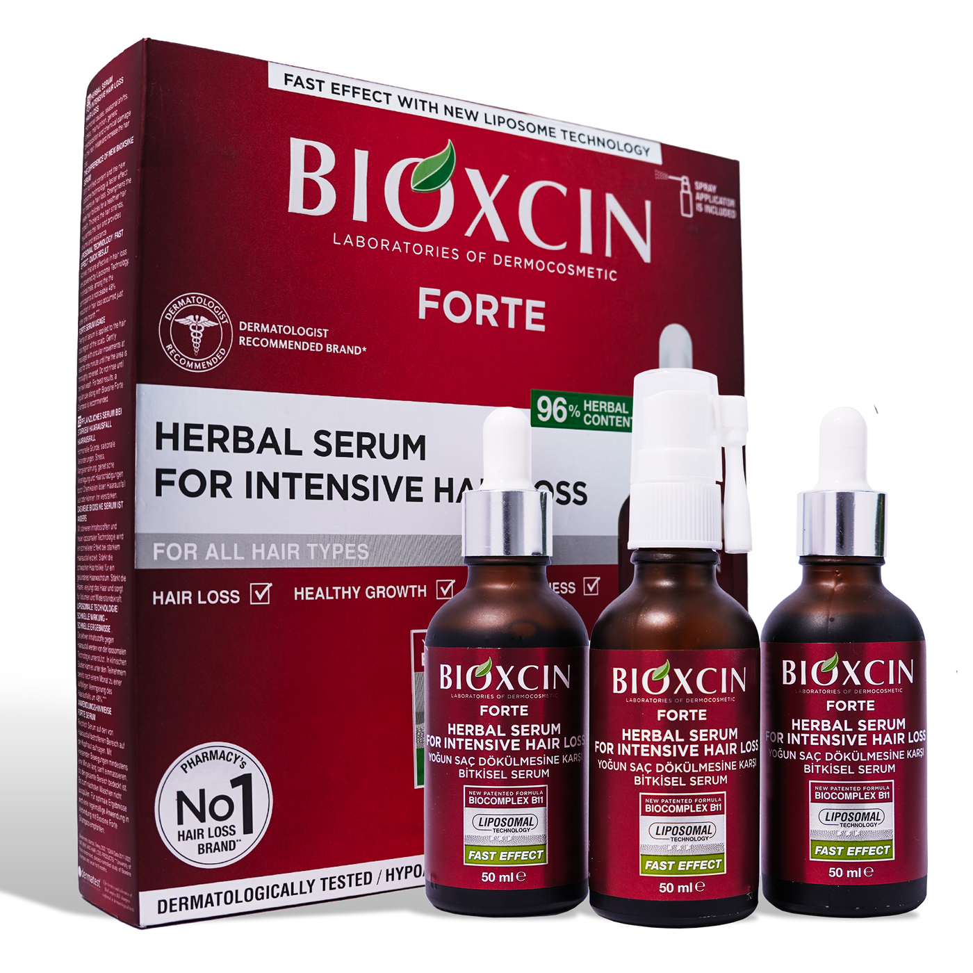 Bioxcin Forte Herbal Serum Spray is a top-rated hair growth serum based on the active herbal formula BioComplex B11, which is crafted from specially combined phyto-extracts to effectively reduce hair loss and promote hair growth for thicker and stronger hair. This serum contains no parabens, phthalates, or dyes.