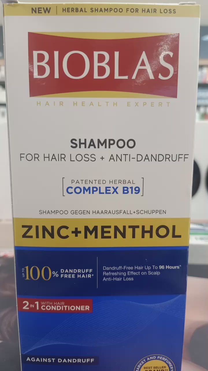 Bioblas Anti-Hair Loss Against Dandruff Shampoo (Zinc + Menthol) 360ml offers a dual solution to hair loss and dandruff. Infused with Zinc Pyrithione and Menthol, it deeply cleanses, refreshes, and relieves scalp irritation. The patented Herbal Complex B19 strengthens hair roots, reduces breakage, and promotes overall hair health. Dermatologically tested and formulated to match scalp pH, this shampoo is free from parabens and phthalates, ensuring a safe and effective cleansing experience. With continuous use, your scalp feels revitalized, and your hair appears stronger, thicker, and dandruff-free.